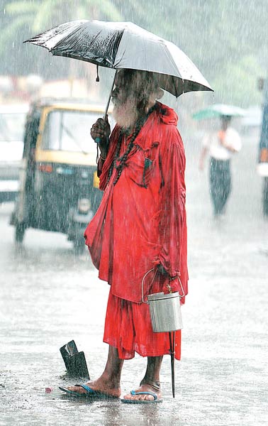 힌두교의 성자가 우산으로 장마 비를 가린 채 구하티 거리를 정처 없이 걸어가고 있다.