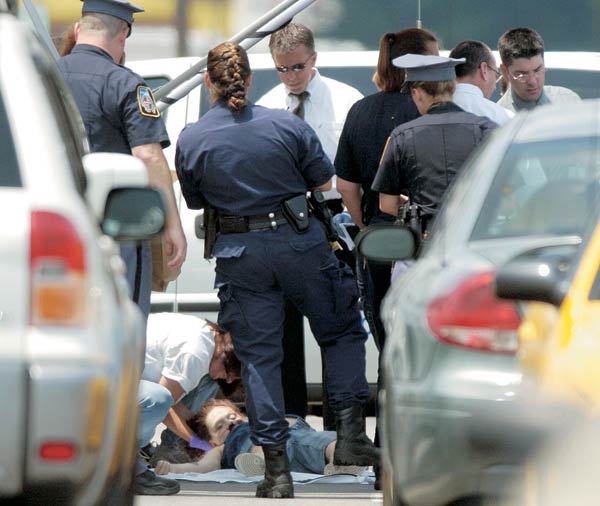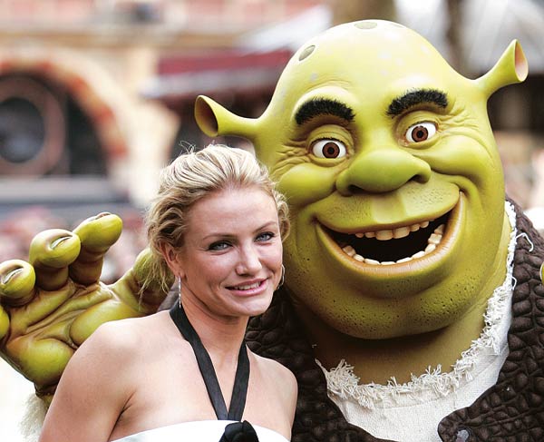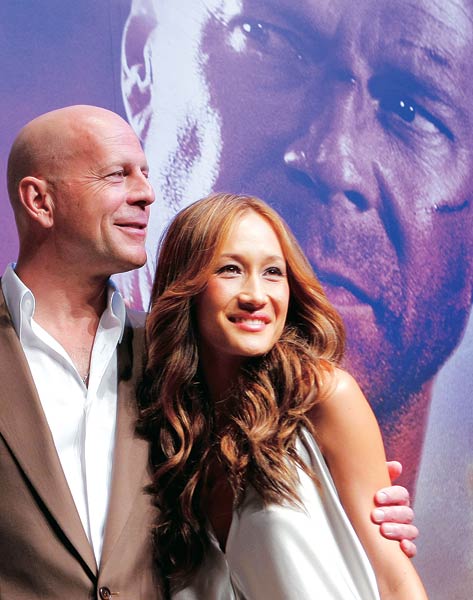 영화 다이 하드 4.0 홍보차 일본을 방문한 할리웃 스타 브루스 윌리스(왼쪽)와 매기 Q가 12일 도쿄에서 대형 영화 포스터를 배경으로 기자회견을 갖고 있다.