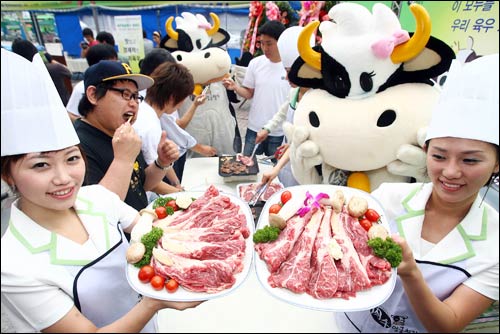 6월 9일 육우데이를 하루 앞둔 8일 한국낙농육우협회 주최로 서울 잠실동 롯데마트 월드점 앞에서 열린 육우데이 행사에서 시민들이 무료로 제공된 육우를 맛보고 있다. 육우란 젖소 중에서 젖을 짜지 않는 숫소를 식용 목적으로 사육한 것으로 맛과 품질은 한우에 가까우면서도, 가격은 저렴한게 특징이다. (서울=연합뉴스)