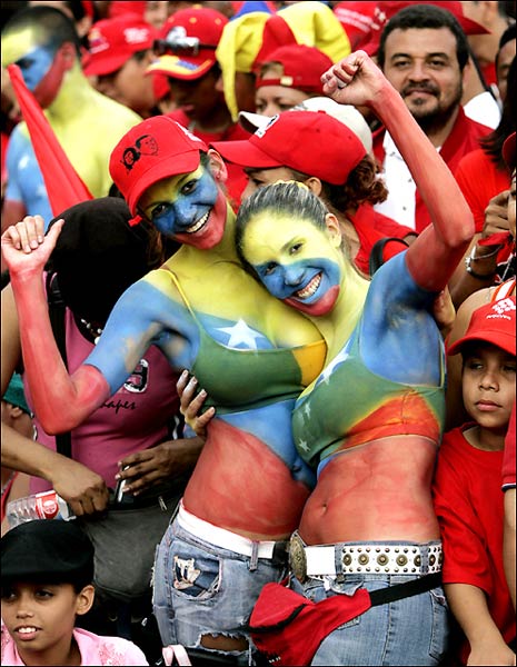 베네수엘라 국기를 보디페인팅한 여성 2명이 2일 수도 카라카스에서 우고 차베스 베네수엘라 대통령의 RCTV 폐쇄 지지 시위를 벌이고 있다. 카라카스 AP 연합뉴스