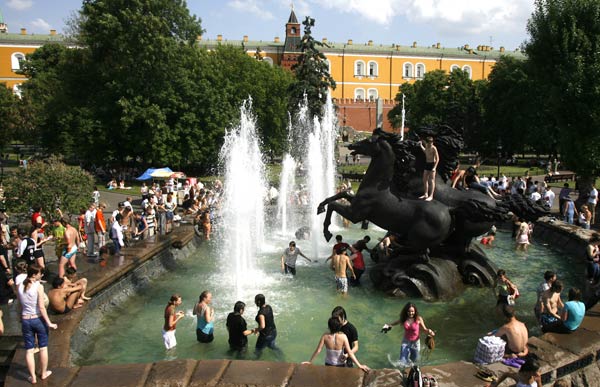 찜통더위에 지친 모스크바 시민들이 알렉산드로프스키 가든의 분수대에 모여 피서를 즐기고 있다.