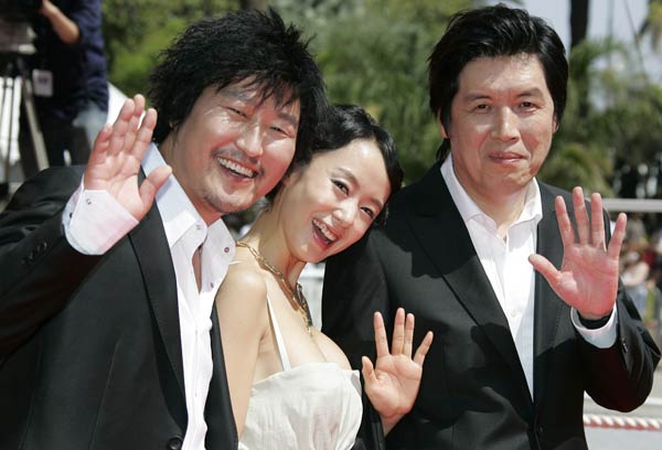 제60회 칸 국제영화제에서 영화 시크릿 선샤인을 홍보하기 위해 칸에 온 배우 송강호(왼쪽부터)와 전도연이 감독 이창동과 함께 보도진에 손을 흔들고 있다.