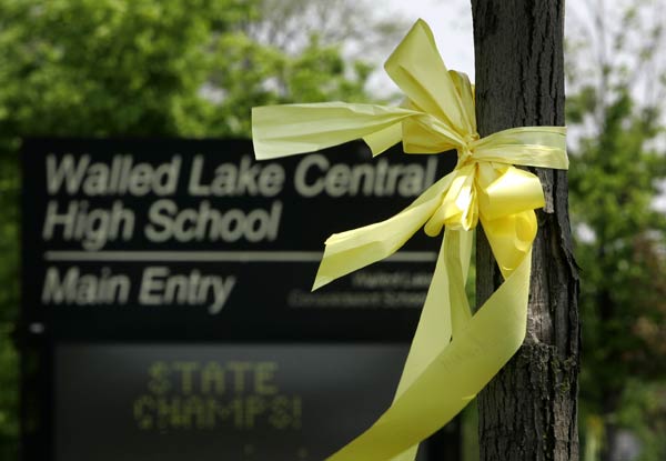 이라크에서 실종된 미군 바이런 파우티의 무사귀환을 기원하는 노란색 리번이 그의 모교인 미시간주 코머스타운십 소재 월드 레이크 센트럴고교앞 나무에 걸려 있다. 미군 당국은 23일 실종된 미군 3인 가운데 한 명의 것으로 보이는 시신을 발견했다고 발표했다.