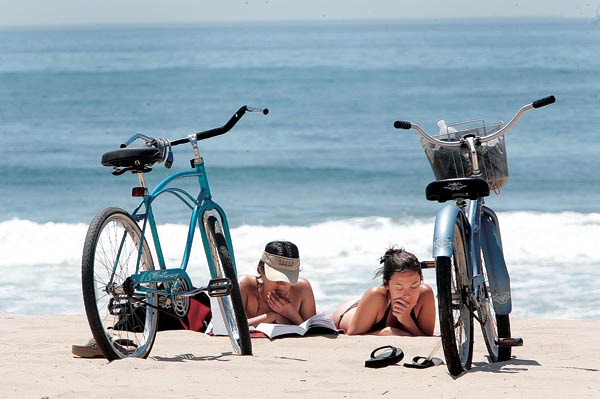 한 여름을 연상케 하는 더위가 LA 일원에 닥쳐와 7일 LA 다운타운이 92도, 밸리 지역이 95도까지 올라가는 등 LA 일원 곳곳에서 낮 최고기온이 90도를 웃돌았다. 국립기상대는 8일에도 90도대의 더위가 계속되고 일부 밸리지역 최고기온이 100도를 넘어설 것으로 전망했다. 베니스비치 모래사장에서 비키니를 입은 두 여인이 자전거를 세워두고 독서 삼매경에 빠져 있다.