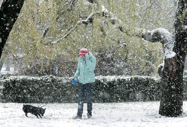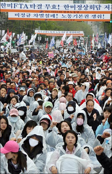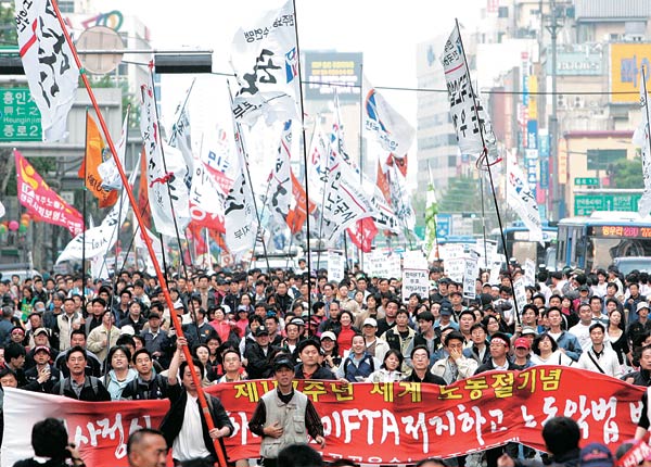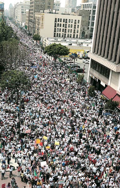 멕시코 태생인 루이스 만시네스(4)가 1일 시카고에서 열린 이민집회에 앞서 시위자들이 펼쳐 놓은 대형 성조기를 향해 손을 뻗치고 있다.
