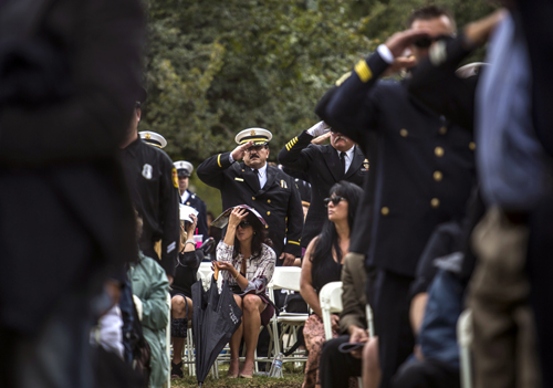 유니폼을 입은 소방국 관계자들과 임무수행중 목숨을 잃은 16명의 소방대원들의 유가족들이 17일 새크라멘토에서 열린 추모식에서 희생자들에게 경의를 표하고 있다. 이들 16명의 이름은 캘리포니아 소방대원 기념비에 새겨졌다.