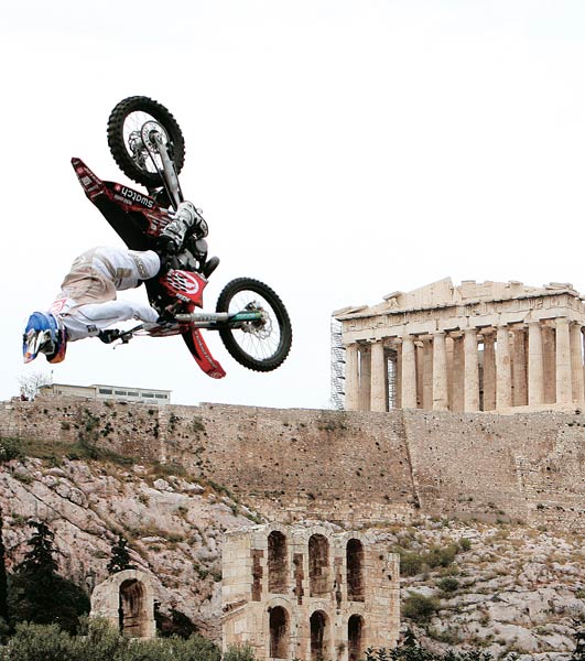 25일 그리스 아테네의 아크로폴리스 언덕 앞에서 열린 레브 불 모터사이클 월드 챔피언십 대회에 출전한 스위스의 맷 리뷰드가 모터사이클로 멋진 공중회전 묘기를 보여주고 있다.