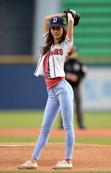 배우 김정민이 17일 오후 서울 송파구 잠실야구장에서 열린 2015 KBO 리그 두산 베어스와 롯데 자이언츠의 경기에서 시구를 하고 있다.