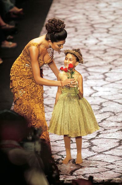 뭄바이에서 열리고 있는 라크메 패션위크에서 29일 인도 디자이너 니타 룰라의 의상을 입은 전 미스 유니버스 수시미타 센이 딸 르네이로부터 꽃다발을 받고 있다.