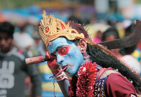 인도 가하티의 브라마푸트라 강에서 26일 열린 힌두교 축제 아쇼카스타미에서 여신 칼리로 분장한 남성이 칼춤을 추고 있다. 브라마푸트라 강은 축제기간에 갠지스 강처럼 성스러워진다고 믿어져 수많은 인파가 목욕하기 위해 몰린다.