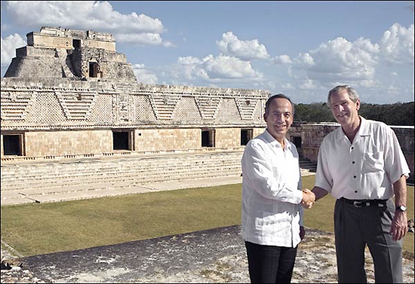조지 W 부시(오른쪽) 미국 대통령이 13일(현지시간) 중남미 마지막 순방국인 멕시코의 마야 유적지 욱스말에서 펠리페 칼데론 대통령과 악수를 하고 있 다. 부시 대통령은 브라질, 우루과이, 콜롬비아, 과테말라 등 5개국을 의욕적으로 순방했으나 곳곳에서 강력한 반미·반부시 시위에 부딪혀 중남미 국가의 마음을 되돌리는 데 실패했다. 욱스말=AFP연합뉴스