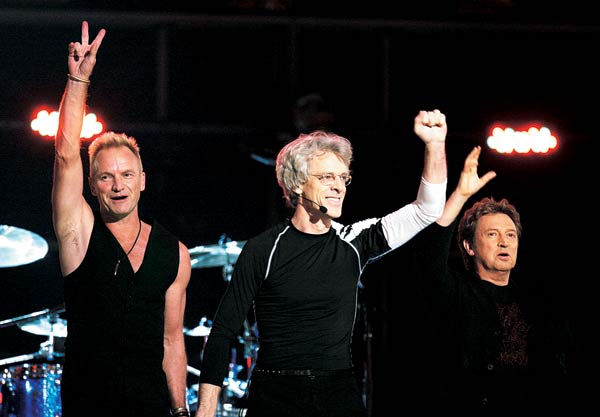 70년대 인기 록그룹 폴리스의 멤버들이 오랜만에 모여 히트곡 록샌(Roxanne)을 연주했다. 왼쪽부터 스팅과 스튜어트 코플랜드, 앤디 서머스.