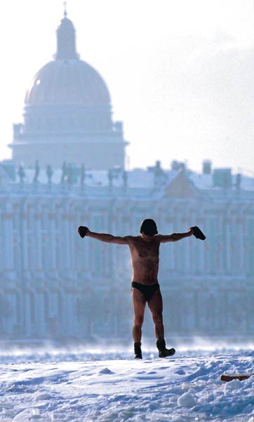 8일 중국 지린에서 겨울 수영 매니아들이 몸을 따뜻하게 하기 위해 눈을 몸에 문지르고 있다. (AP=연합뉴스)