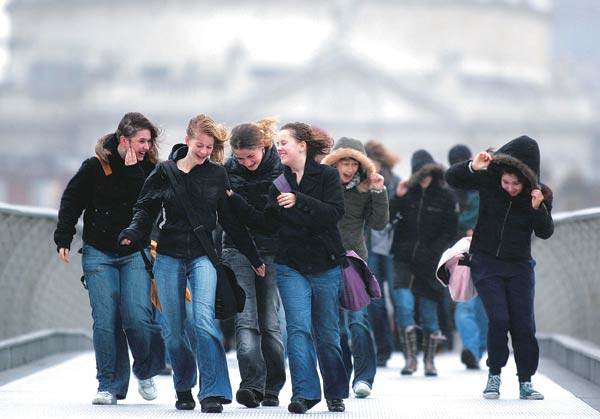 영국 런던의 여학생들이 18일 강한 바람이 부는 밀레니엄 다리를 건너며 밝은 웃음을 짓고 있다.