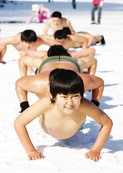 14일 양평에서 열린‘한강 얼음물 뛰어들기’대회에 앞서 한 소년이 얼음위에서 독한 표정으로 팔 굽혀펴기를 하며 준비운동을 하고 있다.