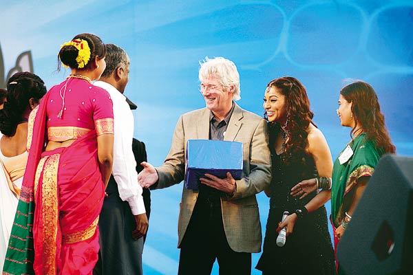 할리웃 영화배우 리처드 기어(가운데)가 10일 인도 뭄바이에서 열린 HIV 예방 이벤트에 참가, HIV 예방 노력에 힘쓴 섹스산업 관련 직원들을 표창하고 있다. 옆은 발리우드 배우 비파사 바수.