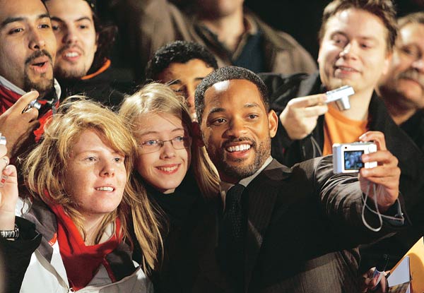 할리웃 영화‘행복을 찾아서’의 시사회에 9일 독일 베를린에서 열렸다. 주인공 배우 윌 스미스(가운데)가 몰려든 독일의 팬들과 즉석촬영을 하고 있다.