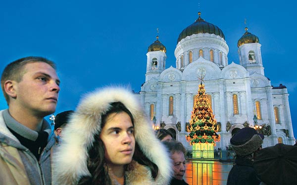 러시아 정교회가 크리스마스로 지키는 7일, 모스크바의 정교회에 모여든 젊은 신자들이 크리스마스 트리와 장식용 전구로 화려하게 불 밝혀진 건물을 바라보고 있다.
