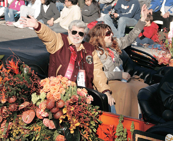 아메리칸 혼다 자동차가 동화속 캐릭터들을 바탕으로 만든 꽃차 ‘원스 업온 어 타임’에 등장한 하늘을 나는 용이 입에서 불꽃을 내뿜으며 볼거리를 제공하고 있다.