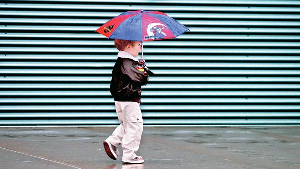 26일 가랑비가 내리는 워싱턴주 브레메턴의 거리에서 한 어린이가 우산을 쓰고 어딘가를 향해 걸어가고 있다.