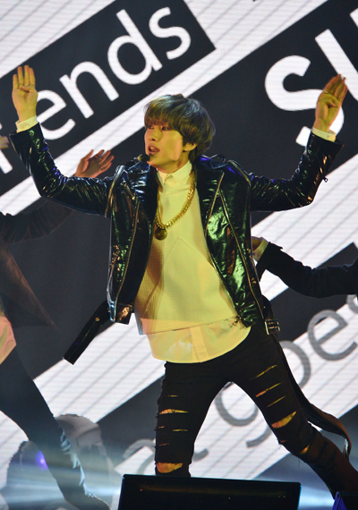 5일 오후 서울 삼성동 SM TOWN 코엑스 아티움에서 열린 수퍼주니어-D&E(동해&은혁) 첫 앨범발매 기념 쇼케이스에서 은혁이 새 노래 'The Beat Goes On'을 열창하고 있다.