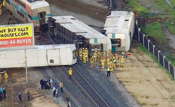 24일 오전 5시40분께 캘리포니아 주 벤투라 카운티 옥스나드 시에서 통근 열차가 대형 트레일러와 충돌하면서 객차가 탈선해 승객 28명이 부상했다. 이날 사고는 벤투라 카운티를 출발해 LA 다운타운 유니온역으로 가던 메트로 링크 '벤투라 카운티 라인 102호' 통근 열차가 옥스나드 시 5번가와 라이스 애비뉴에서 트레일러와 충돌하면서 발생했다. 소방관들이 트레일러와의 충돌로 탈선한 통근열차 사고 현장을 찾아 조사를 벌이고 있다.