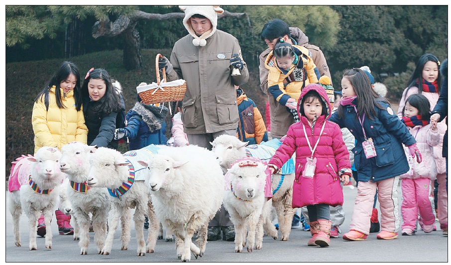 2014년 말띠 해가 저물고 이제 양띠 해인 2015년이 밝았다. 새해‘을미년’은 청양의 해로, 온순하고 평화로운 특성을 가진 양에 진취적이고 긍정적인 색깔인 푸른색이 더해져 더욱 힘차면서도 조화롭게 전진하는 한 해가 되리라는 기대가 높아지고 있다. 새해를 맞으며, 평화와 행복이 온 세상에 깃들고 모든 일들이 술술 풀려가기를 희망하는 마음들이 하나로 모인다. 용인 에버랜드에서 한복을 차려 입은 양들이 을미년 양띠 해의 출발을 축하하고 있다.
