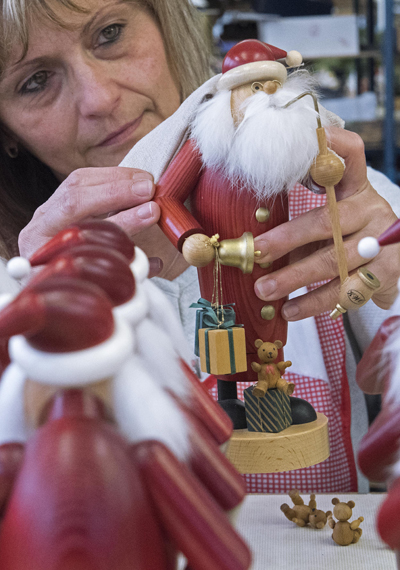 17일 독일의 한 목공예 전문점에서 한 직원이 담배피우는 산타클로스를 만들고 있다.