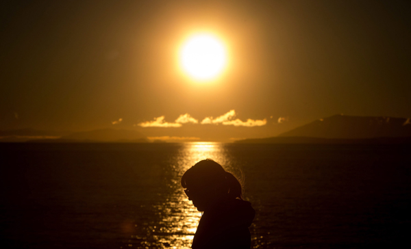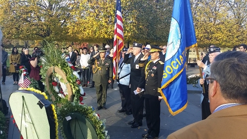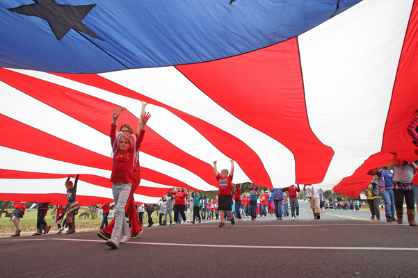11일 아칸소 엘도라도에서 휴즈 굿윈 초등학교 학생들이 대형 성조기를 들고 베테런스데이 퍼레이드를 하고 있다.