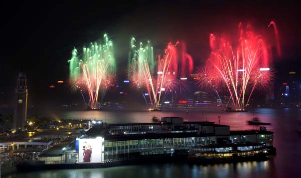 홍콩 빅토리아 항구에서 1일 열린 중국 국경일 축하 불꽃놀이가 화려하게 펼쳐지고 있다.