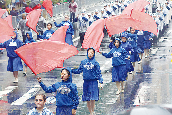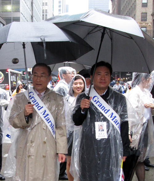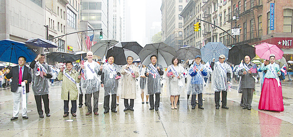 박근혜 대통령 뉴욕방문 행사 문제로 갈등을 빚고 있는 민승기(오른쪽) 뉴욕한인회장과 손세주 뉴욕총영사가 4일 코리안 퍼레이드 시작 전 출발선에서 어색하게 조우했다. 서로 인사를 하고 대화도 나눴지만 내내 어색함이 감돌았다. 퍼레이드가 끝난 후 공식행사에서도 동석을 했지만 끝내 화해의 악수는 하지 않았다.