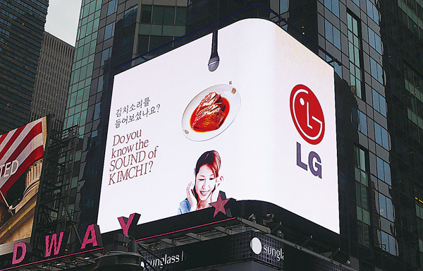 LG전자가 24일 맨하탄 타임스스퀘어에서 대형 전광판을 통해 한국의 대표적인 식품인 김치의 우수성과 김치를 전용 냉장고에 보관하는 한국 문화를 소개하는 영상을 상영하고 있다. 65초 분량의 이 영상에서 김치가 몸에 좋은 유산균이 많은 식품이라는 점을 알리고, 유산균이 생길 때 나는 '톡톡' 소리를 강조했다고 LG전자는 설명했다.