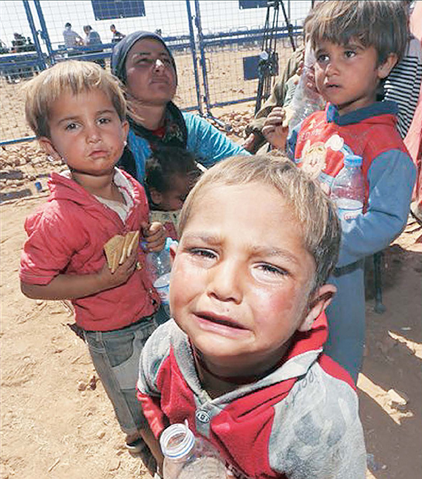 23일 터키 국경을 넘어온 시리아 난민아동이 겁에 질린 채 울고 있다. 지난 4일간 이슬람 국가(IS)의 침공을 피해 터키로 건너온 시리아 난민의 수는 20만명에 달한다.