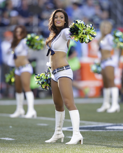 시애틀 시혹스의 치어리더팀 ‘갈스’ 치어걸들이 4일 그린베이 패커스와의 풋볼 경기에 앞서 춤을 추며 관객들의 지루함을 달래주고 있다.