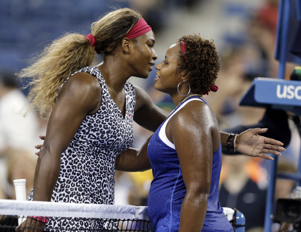 러시아의 마리아 샤라포바(오른쪽)가 27일 US오픈 2라운드 경기에서 루마니아의 알렉산드라 둘게루를 2대1로 누르고 승리한 후 악수를 청하고 있다.
