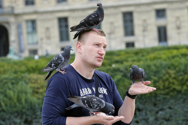 프랑스 파리 루브르 박물관 앞에서 29일 한 여행객 머리와 어깨 위에 비둘기들이 앉아 있다.