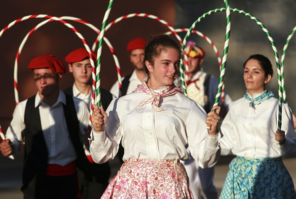 프랑스 남서부 지역에서 열린 바스크 전통 체육대회에서 폴리키 바스크 댄스팀이 춤을 추고 있다.