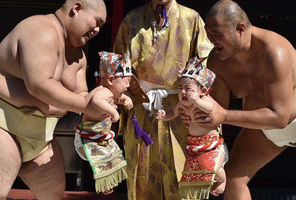 일본 도쿄에서 지난 20일 열린 ‘아기 울리기 대회’ 중 아이들이 울고 있다. 일본 부모들은 스모 선수들이 아기를 안고 울리면 아기들이 건강하게 장수할 것이라고 믿는다.