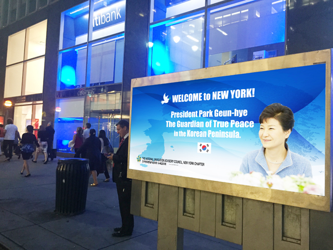 유엔 총회참석차 25일 뉴욕을 방문하는 박근혜 대통령을 환영하는 옥외 광고판이 맨하탄 매디슨 애비뉴와 42가의 공중전화 부스에 설치돼 눈길을 끌고 있다. 민주평통 뉴욕협의회가 가교기업 홍보사에 의뢰해 제작된 광고판에는 한반도 지도와 박근혜 대통령의 사진이 배치됐으며, ‘뉴욕방문을 환영합니다.’라는 글귀가 영문으로 적혀있다.