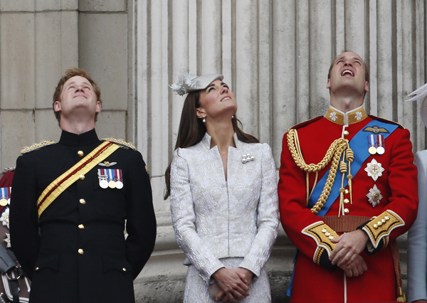 14일 런던 버킹검 궁전에서 열린 엘리자베스 2세 여왕의 생일 축하연에서 해리 왕자(왼쪽부터)와 케이트 공작부인, 윌리엄 왕세자가 로열 에어포스 비행단의 공중묘기를 지켜보고 있다.