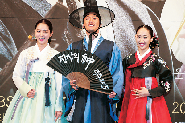 16일 오후 서울 강남구 논현동 임페리얼 팰리스 호텔에서 열린 KBS 2TV 특별기획드라마 ‘장사의신-객주 2015’ 제작발표회에서 한채아(왼쪽부터), 장혁, 김민정이 포즈를 취하고 있다.