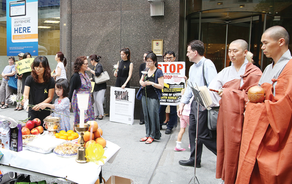 세월호 침몰사고 희생자들을 위한 '49재 추도식'이 4일 맨하탄 뉴욕총영사관 빌딩 앞 인도변에서 거행됐다. 김은주 전 뉴욕한인교사협회장이 주도한 이날 49재 추도식에는 30여명의 한인들이 참석해 희생자들의 넋을 기리며 다시는 이 같은 비극이 되풀이 되지 않기를 빌었다. 추도식에 참석한 한인 모녀가 헌화하고 있다.