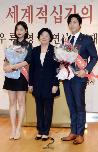 유중근 대한적십자사 총재(가운데)가 8일 오전 서울 중구 대한적십자사 본사에서 열린 '제67회 세계적십자의 날' 기념식에서 탤런트 류수영(오르쪽)과 오연서에게 홍보대사 위촉패를 전달한 뒤 기념촬영을 하고 있다.