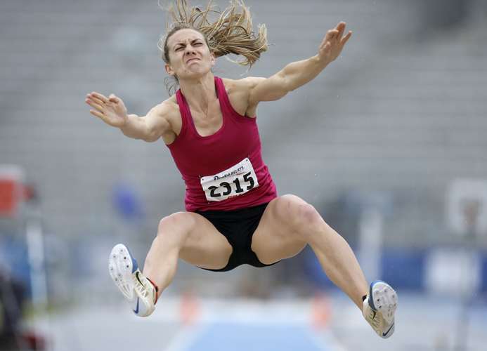 24일 아이오와 디모인에서 열린 드레이크 릴레이 육상경기대회에서 린제이 리토우가 7종경기 넓이뛰기에 도전하고 있다.