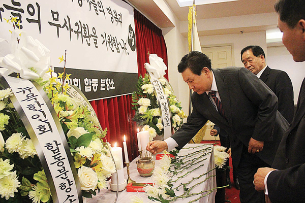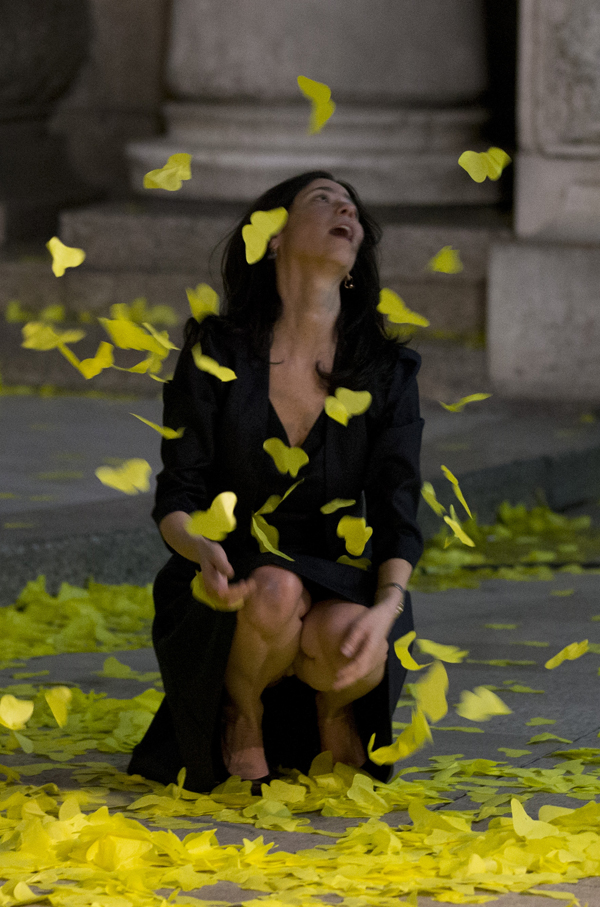 21일 뉴멕시코시티의 미술궁전 앞에서 가브리엘 가르시아 마케스 장례식장에서 한 추모객이 노란색 종이나비를 날리고 있다.
