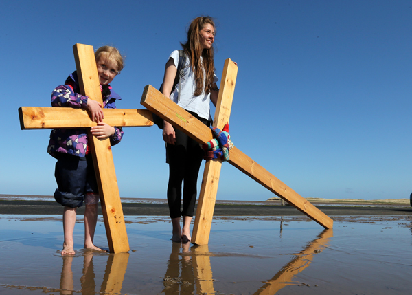 굿 프라이데이인 18일 영국의 한 해변에서 순례자들이 십자가를 들고 걸어가다가 쉬고 있다.
