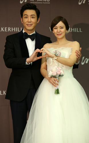 배우 심이영-최원영 커플이 지난달 28일 오후 서울 강남구 코엑스 워커힐에서 결혼식에 앞서 열린 기자회견에서 포즈를 취하고 있다.