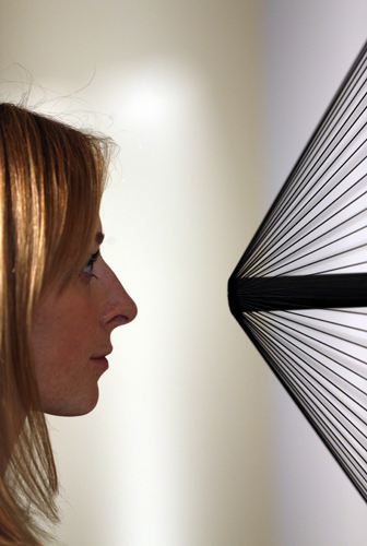 런던 중심부의 한 갤러리에서 24일 열리고 있는 라틴아메리칸 유러피안 작가들의 카이네틱아트 전시회에서 한 갤러리 직원이 장 피에르 아바랄의 작품을 유심히 들여다보고 있다.