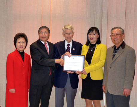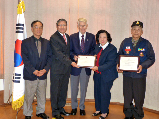 한국전기념비 건립성금으로 김옥련 이스트베이 한미노인봉사회 회장(오른쪽 두번째)이 2,000달러를, EB한미노인봉사회원들이 600달러를 기탁해 17일 감사패를 받았다.