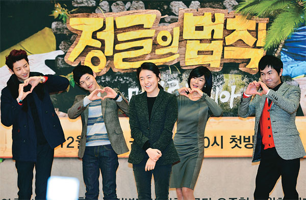 박미연(가운데) 연출이 17일 오후 서울 양천구 목동 SBS 홀에서 열린 SBS TV ‘정글의 법칙 IN 미크로네시아’ 제작발표회에서 출연진의 하트를 받으며 포즈를 취하고 있다. 왼쪽부터 아이돌 그룹 ‘EXO’의 가수 찬열, ‘제국의 아이들’의 가수 임시완, 박미연 PD, 배우 예지원, 임원희.